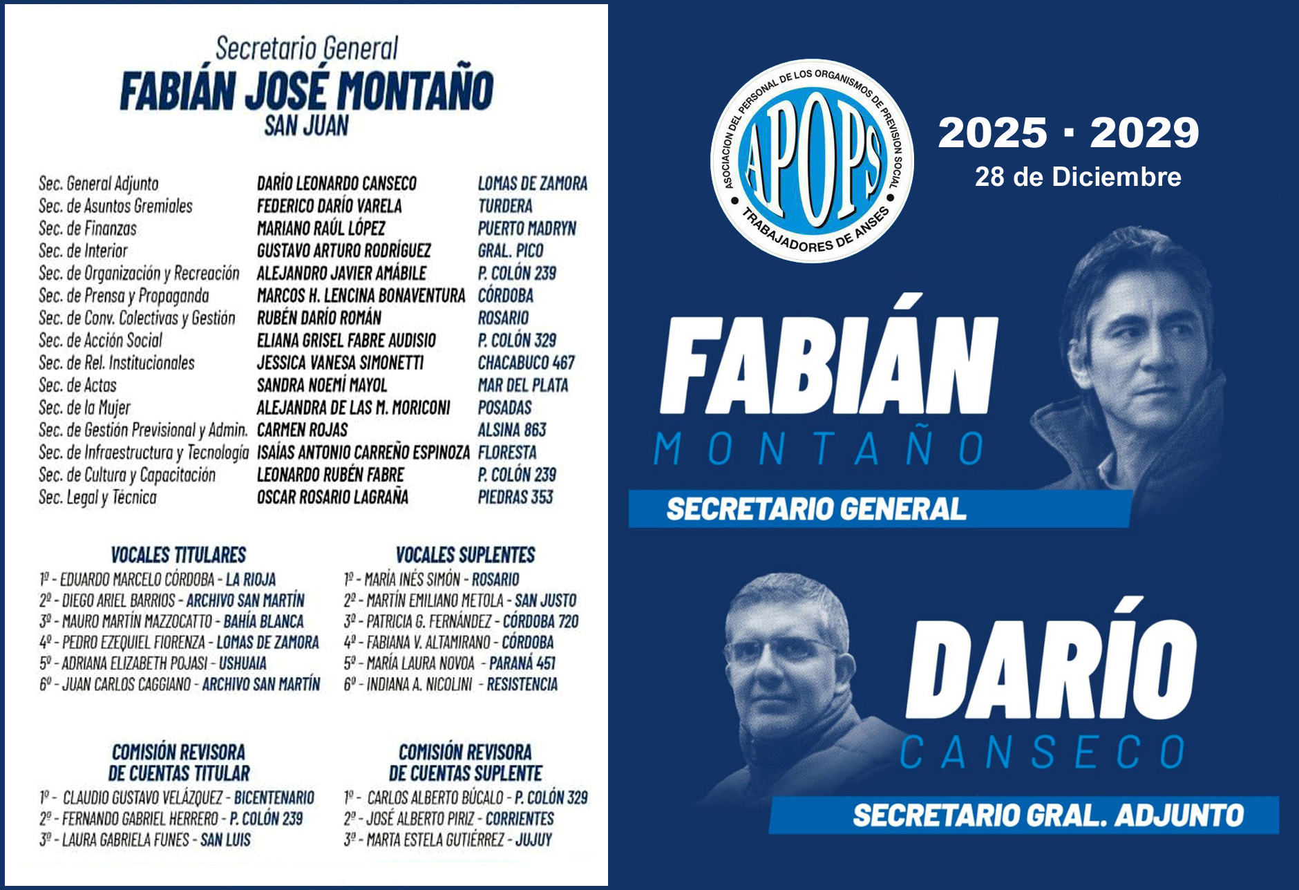 La Asociación del Personal de los Organismos de Previsión Social (APOPS), gremio que representa a las y los trabajadores de ANSES que conduce Leonardo FABRE, celebró el miércoles 24 de septiembre las Elecciones Nacionales de renovación de autoridades para el período 2025-2029 que consagraron como secretario general a Fabián MONTAÑO -hoy secretario adjunto-, y como secretario adjunto a Darío CANSECO -hoy secretario de Organización. Encabezando así la nueva Comisión Directiva Nacional electa que asumirá el 28 de diciembre de 2025 y que contará con FABRE al frente de la Secretaría de Capacitación y Cultura.