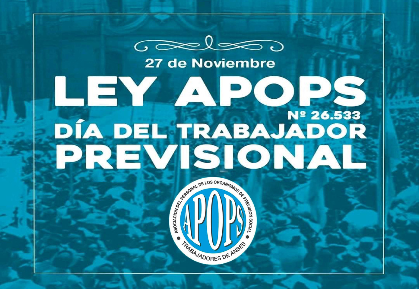 El DÍA DEL TRABAJADOR PREVISIONAL se celebra en todo el Pais cada 27 de noviembre a partir de la Ley APOPS Nº 26533 del año 2009, fecha que plasma y recuerda cuando para ese día de 1943 el por entonces Coronel Juan Domingo PERÓN, asumió al frente de la Secretaría de Trabajo y Previsión, marcando un hito histórico para el Movimiento Obrero y la Seguridad Social de la Nación.