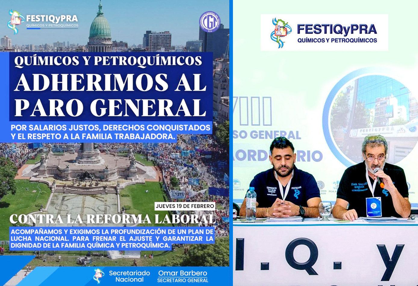 La Federación de Sindicatos Químicos y Petroquímicos de la República Argentina (FESTIQYPRA) que conduce Omar Barbero desde la Secretaría General, secundado desde la Adjunta por Edgardo Gómez, anunció su adhesión al PARO GENERAL convocado por la Confederación General del Trabajo de la República Argentina. En este contexto, FESTIQYPRA convocó a todos sus sindicatos adheridos a expresar esta jornada de lucha en cada provincia, en cada ciudad y en cada lugar de trabajo, remarcando que «la unidad se construye en el territorio».