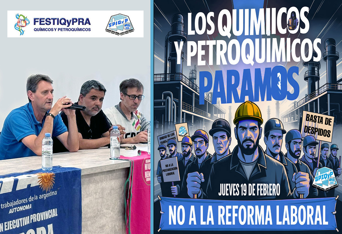 Inmediatamente anunciado el PARO GENERAL, justamente el SPIQYPR RIO III que conduce su secretario general Lucas Felici, anunció que «ante la terrible situación que estamos viviendo no solo los químicos y petroquímicos, sino todo el movimiento obrero, y ante el enorme retroceso que buscan con la reforma laboral, afectando no solo nuestro convenio de trabajo, sino todas las garantías y derechos de nuestros trabajadores, es que los químicos y petroquímicos nos ponemos en Estado de Alerta y Movilización, acción que lleva a la huelga el día jueves 19 de febrero, de la cual paralizaremos toda nuestra actividad». Y agregó: «Esta nefasta reforma nos lleva a la precarización total de las y los trabajadores. «¡Nuestras conquistas y derechos se defienden, en los portones y en la calle!», reivindicó e instó a la ¡Unidad de los Trabajadores!».