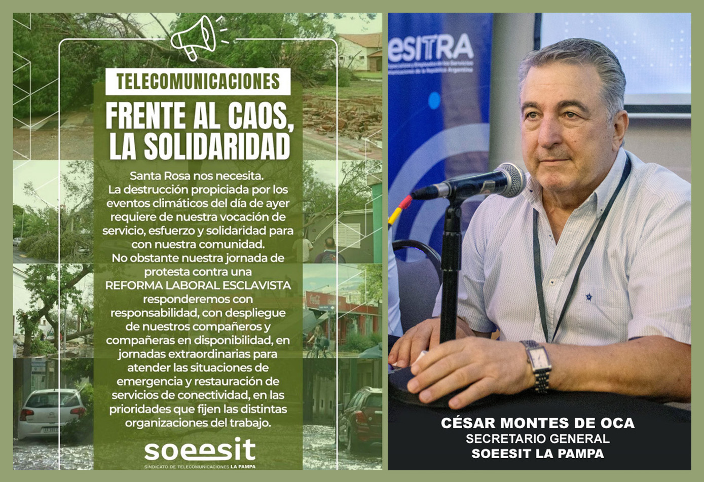 El Sindicato de Obreros, Empleados y Especialistas de los Servicios e Industrias de las Telecomunicaciones de La Pampa (SOEESITLP) que conduce César Montes de Oca, secundado desde la Adjunta por Romina Montes de Oca, electa Secretaria de Prensa nacional de la FOEESITRA, ante la destrucción propiciada por los eventos climáticos de este miércoles 18 de febrero, bajo la consigna «Santa Rosa nos necesita» manifestó que «frente al caos» de la situación es imprescindible «la solidaridad».